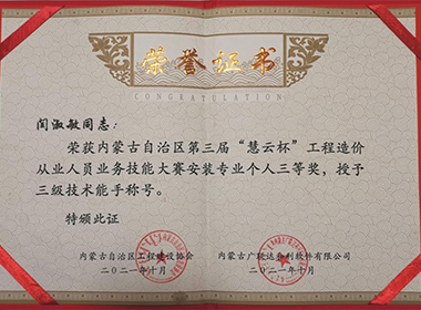 我司闫淑敏获得《三亿在线(中国)自治区第三届“慧云杯”工程造价从业人员业务技能大赛》个…